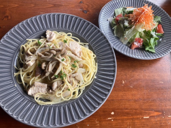「鶏胸肉ときのこのスパゲッティーニ&トマトと人参のサラダ」1,300円