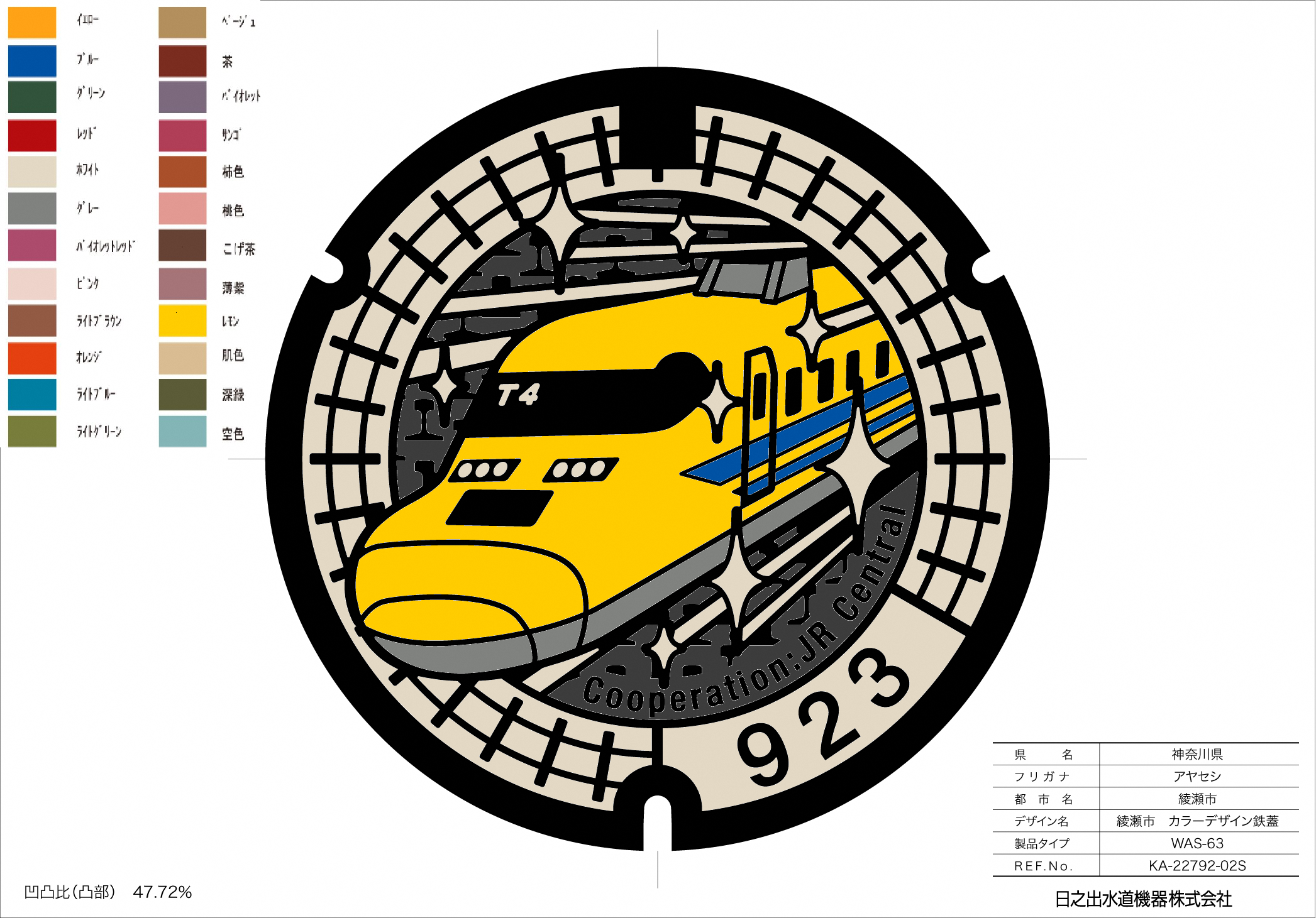 旧綾瀬町は、東海道新幹線建設時における試験用モデル線の起点となった経緯を有しています。綾瀬市では、令和7年に惜しまれつつ引退したドクターイエローを間近に見ることができ、市民にとっても親しまれてきた存在でした。こうした歴史的背景と地域の記憶を踏まえ、JR東海の協力のもと、ドクターイエローをモチーフとしたマンホール蓋の作成に至ったものです。