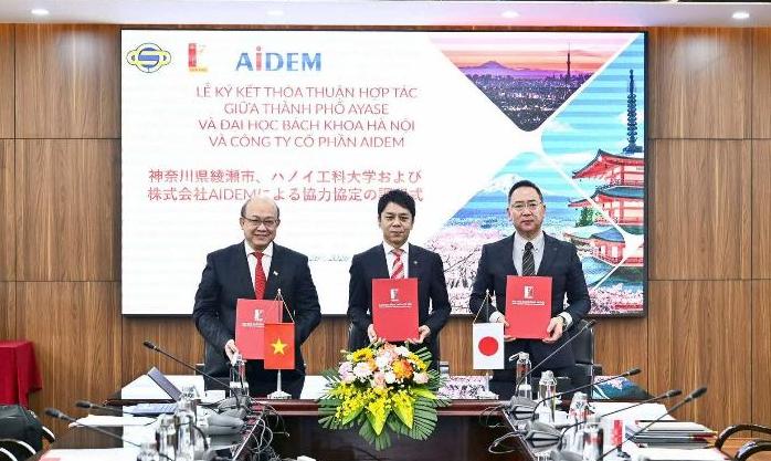 令和8年1月26日(月曜日)ベトナムハノイ工科大学において、同大学(フイン・クエット・タン学長)、綾瀬市(橘川佳彦市長)、株式会社アイデム(栗原健治取締役部長)の3者において『人材育成に関する覚書』を締結いたしました。